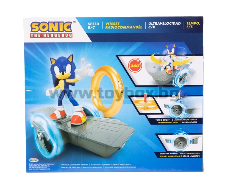 Комплектът включва подвижна Sonic фигура, R/C скейтборд и контролер Gold Ring. Контролерът е вдъхновен от пръстените на Sonic от видеоигрите Sonic the Hedgehog™ и има 3 бутона за пълен контрол: напред, завъртане и завъртане на 360 градуса, както и Turbo режим, който осветява колелата за този допълнителен тласък! Sonic Skate R/C е в мащаб приблизително 1:5 с дизайн, вдъхновен от видеоигрите Sonic the Hedgehog™.