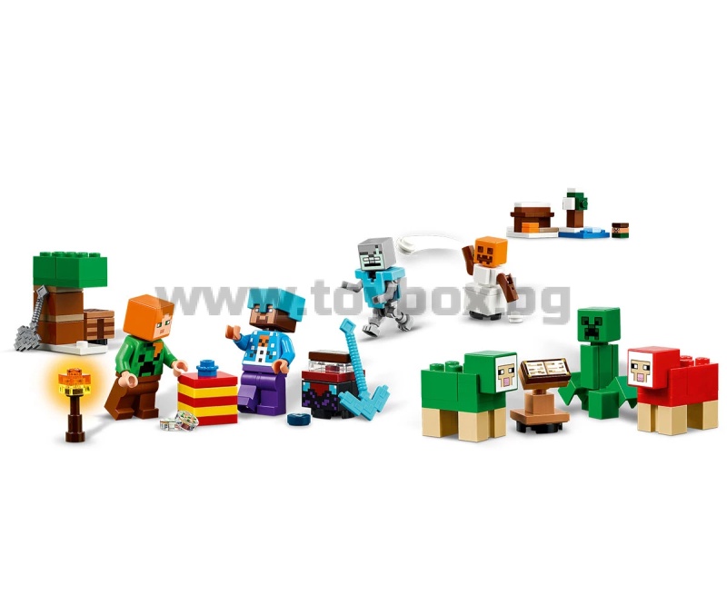 - Коледни минифигури LEGO® Minecraft® –минифигурите включват Алекс, Стив , Creeper™, удавник, скитник, снежен голем, зомби и селянин от селото на Дядо Коледа, всички с аксесоари и празнични елементи;