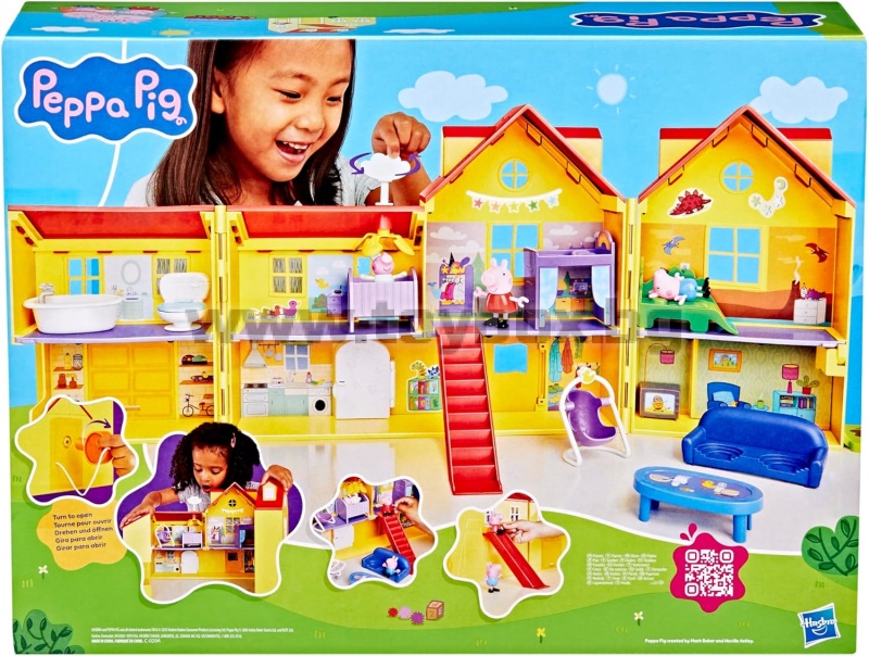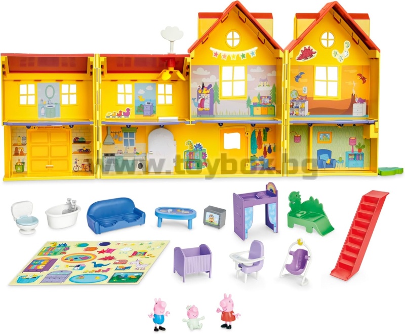- Огромна къща за кукли Peppa Pig: комплектът играчки с ширина 80 см предлага 2 етажа и 7 стаи, включително спални за Peppa, Schorsch и Baby Evie, хол, кухня с хладилник и гараж с врата на панти.