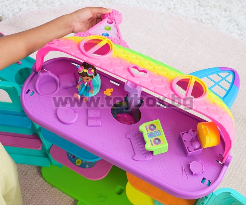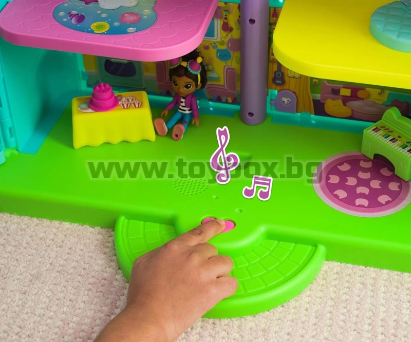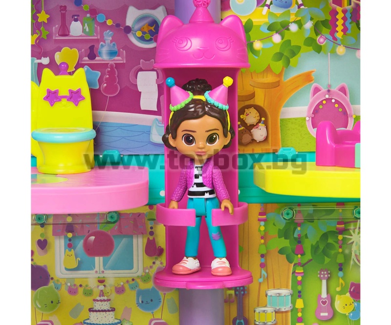 Забавлявай се на DJ масата и използвай Cat-A-Vator асансьора, за да достигнеш до 6 стаи и покривна игрална зона. Пусни доставка в кулата за доставки и натисни бутона, за да откриеш скрити съкровища. Отвори къщата и ще чуеш 6 звукови ефекта от сериала! Играчките Gabby’s Dollhouse са чудесен подарък за момичета и момчета, които обичат популярния сериал на Netflix и харесват ролеви игри със светове от куклени къщи.