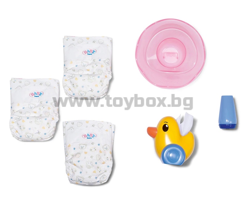 Да започнем с гърнето! С този практичен и забавен комплект, малките „родители“ могат да направят ежедневието на своите кукли още по-реалистично. Комплектът съдържа розово гърне с бутон за „пускане“, три пелени, бутилка със сапунче и забавен диспенсър за кърпички във формата на патенцето Берта. Той е създаден, за да насърчава грижовна игра, като едновременно с това подпомага малчуганите в процеса на приучаване към гърне. Благодарение на реалистичния дизайн и детайлите, играта става по-вълнуваща и увлекателна.