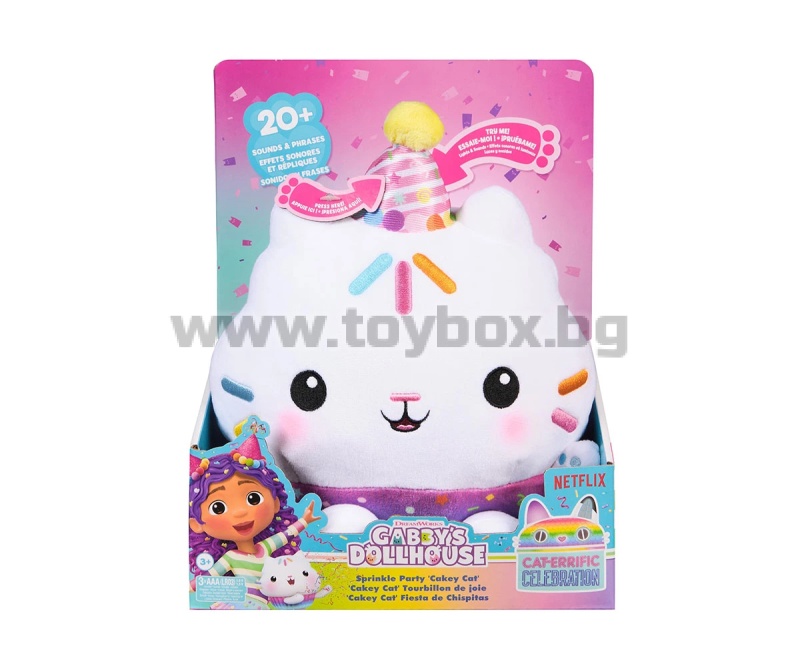 - Name: Spin Master 6071152 - Gabby's Dollhouse Celebrations: Sprinkle Party Cakey Cat Plush, 10-Inch Interactive Stuffed Animal with Sounds