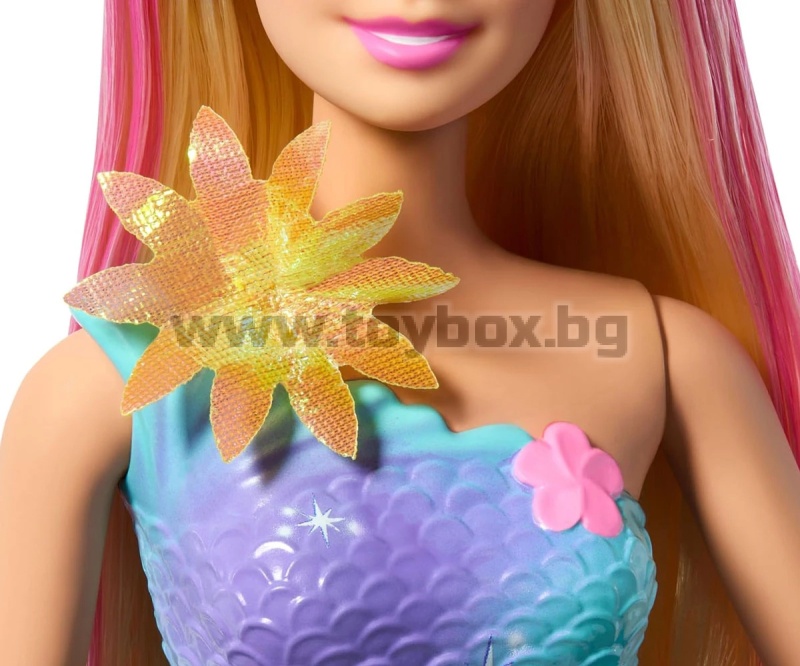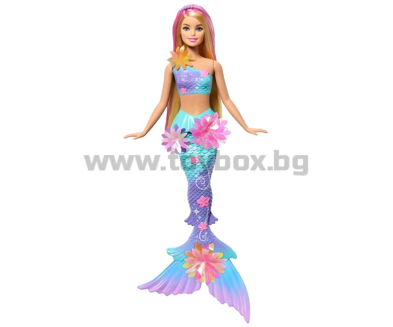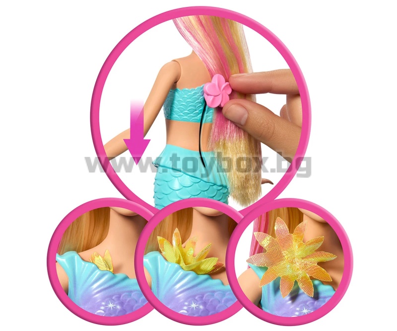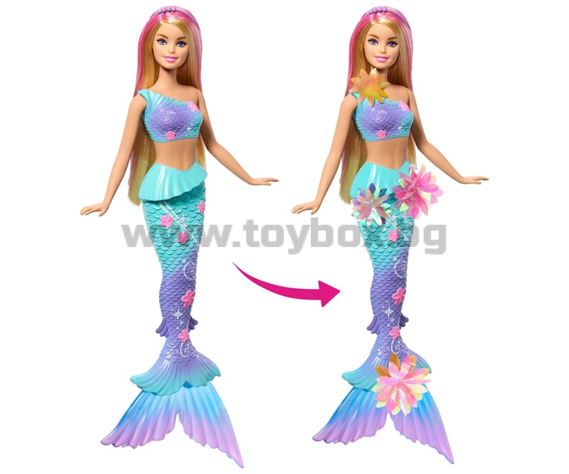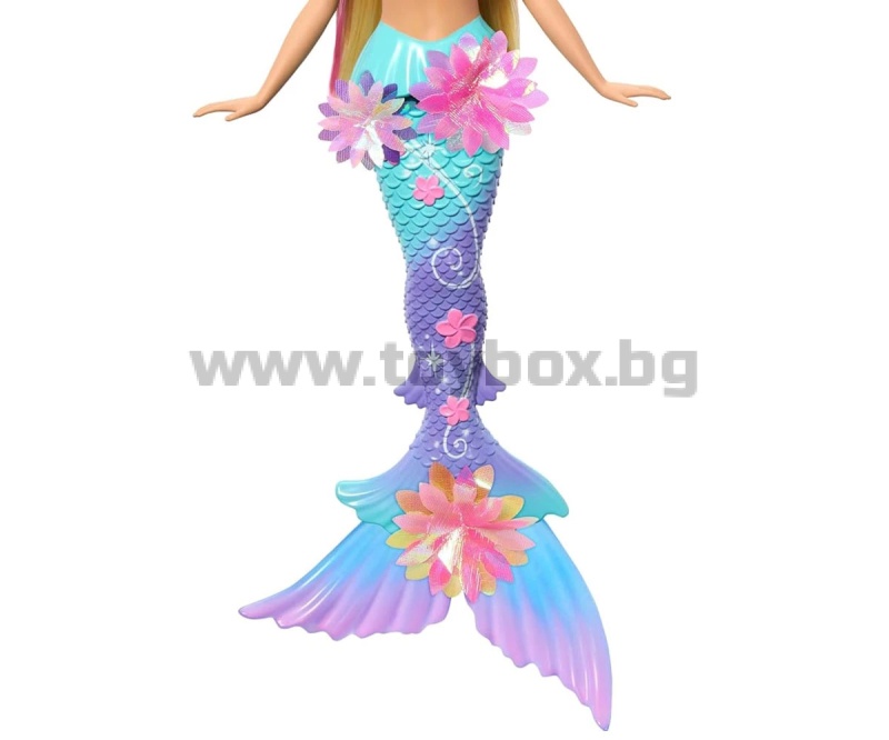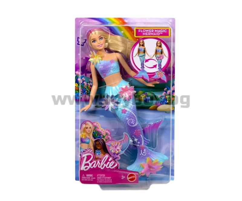 Разцъфни в забавление с Барби Русалка с цветна магия! Потопи се в свят на вълшебство - плъзни лостчето на гърба ѝ и виж как цветя магически „разцъфват“ от корсета до опашката ѝ – отново и отново! Децата могат да играят с тази кукла както на сушата, така и във водата, за вълшебно цветно шоу под слънцето или в морето. С нейните блестящи цветя, преливаща опашка, перлена диадема и дълга руса коса с розови кичури – тази русалка Барби е толкова очарователна. Куклата не може да стои или да плува самостоятелно. Цветовете и декорациите може да варират.