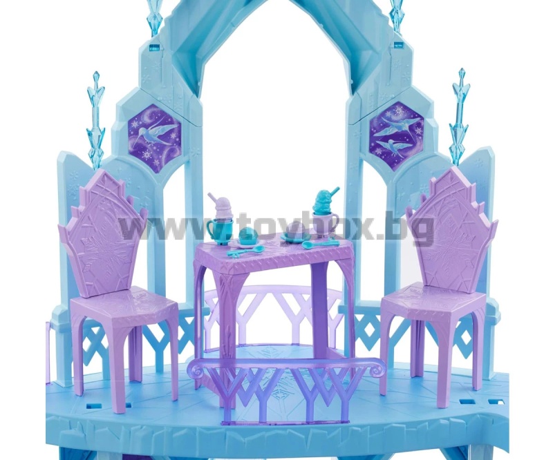 Disney Frozen – Леденият замък на Елза! Потопи се в магията на света на Disney Frozen с този впечатляващ игрален комплект, вдъхновен от Ледения дворец на Елза! Този замък с размер за модни кукли е висок над 75 см и предлага 360° игра с 5 различни зони за забавление.