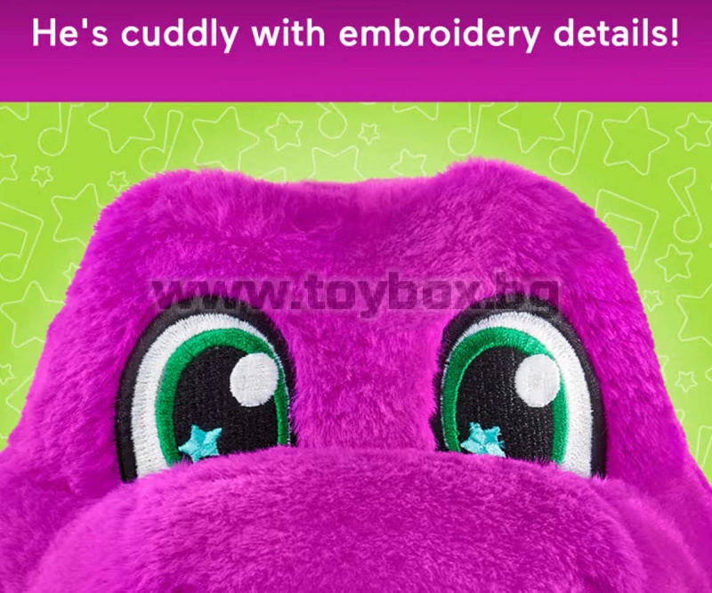 Запей с Барни! Натисни коремчето му и тази мека плюшена играчка с височина 26 см ще започне да пее познати песнички от сериала „Светът на Барни“, включително любимата „I Love You! (I Love Me Too!)“. Децата са поканени да пеят заедно с него и да се забавляват с ритъма на приятелството!
