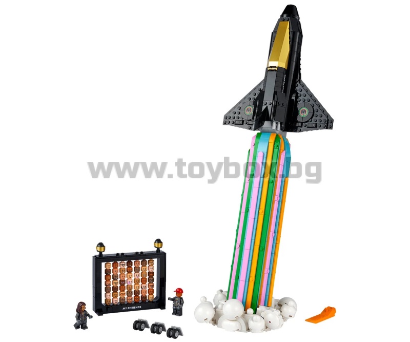 - Какво има в кутията – всичко, от което се нуждаете, за да построите модел на космическа совалка и стойка за показване с цветна реактивна струя, плюс минифигури на Фарел Уилямс и Хелън Уилямс и 49 взаимозаменяеми глави на герои;
