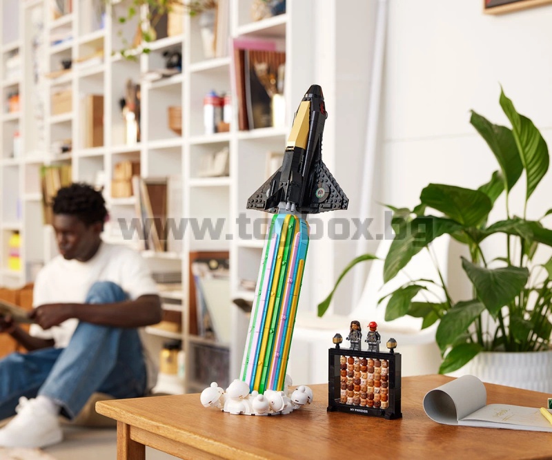 Дайте воля на вътрешната си креативност със строителния проект с космическа совалка LEGO® Icons Над луната с Фарел Уилямс за възрастни.