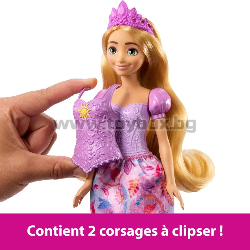 - Тази лесна за обличане кукла Рапунцел се предлага с два корсажа с щипки и две поли, принтирани с характерни шарки.