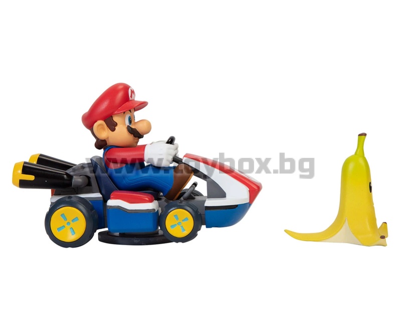 Стартирай състезанието… но внимавай за банана! Съживи епичното забавление от Mario Kart™ у дома с невероятния картинг автомобил на Марио! Завърти колата, натисни надолу и гледай как Марио се завърта на 360° при контакт с банановата кора – точно като в играта!