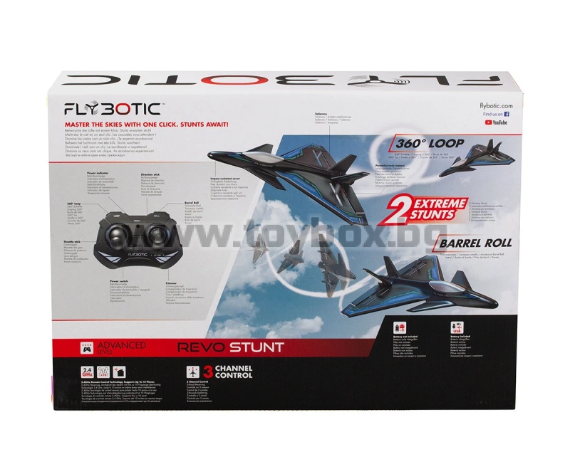 Приготви се за високо летящо вълнение с Revo Stunt – нашият изцяло нов 3-канален акробатичен самолет! Изграден от висококачествена EPP пяна, Revo Stunt не е само здрав, устойчив и издръжлив, но също така лек и лесен за управление. Независимо дали сте опитен пилот или начинаещ, можете с лекота да изпълните две зашеметяващи каскади – „360° Loop“ (преобръщане по кръг) и „Barrel Roll“ (спираловиден ролинг). Създаден за лесно управление, този самолет е идеален за деца над 10 години, които искат да усвоят изкуството на акробатичния полет. Издигни се в небето и стани майстор на въздушните каскади с Revo Stunt!