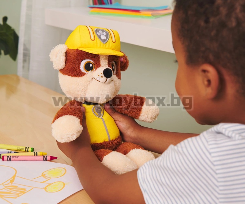 - Този 33 см плюшен Рабъл е облечен в своята жълта строителна униформа с каска, отличен знак PAW Patrol и кафява пухкава козина. Всички Take Along Buddy плюшени играчки имат отпуснати крайници и меко тяло, идеално за носене и игра навсякъде!