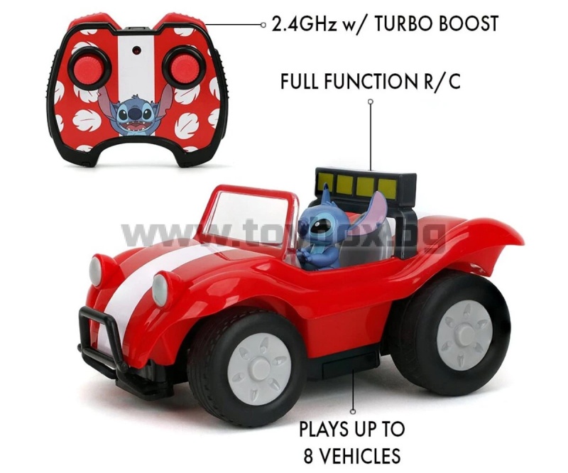 Хаос, скорост и добро настроение – Stitch е готов за щура надпревара! Любимият син герой от Lilo & Stitch е фиксиран в яркочервеното състезателно бъги и изглежда точно като във филмите. Удобното дистанционно управление позволява лесно управление във всички посоки – напред, назад, наляво и надясно. Най-хубавото? С натискане на един бутон Stitch активира турбо функцията и ускорява до 8 км/ч!
