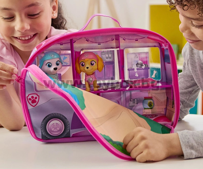 Впусни се в невероятни приключения с PAW Patrol спасителен комплект с минифигурки! Приготви се за свят, изпълнен с действие, екипна работа и забавление със спасителния комплект на Скай! Този страхотен сет включва фигурките на Skye, Liberty и Everest с движещи се крайници и клатещи се главички, както и техните животински приятели – мечето и зайчето. Комплектът идва с текстилен кемпер с дължина 30 см, който се отваря, за да разкрие 5 отделни помещения и постелка, идеална за пикници и игри. Децата могат да използват зона за кацане (crash pad) и подвижната роботизирана ръка, за да създават вълнуващи спасителни мисии, докато спасителната раница с носилка и мрежа може да се постави на всяко от трите кученца. След дълъг ден, пълен с приключения, кемперът се превръща в удобна кутия за съхранение на играчките, идеален за пътуване и лесно прибиране. Този комплект е едновременно образователен и вдъхновяващ, насърчаващ творчеството, ролевите игри и въображението. Идеален подарък за рожден ден, Коледа, Великден или без повод!