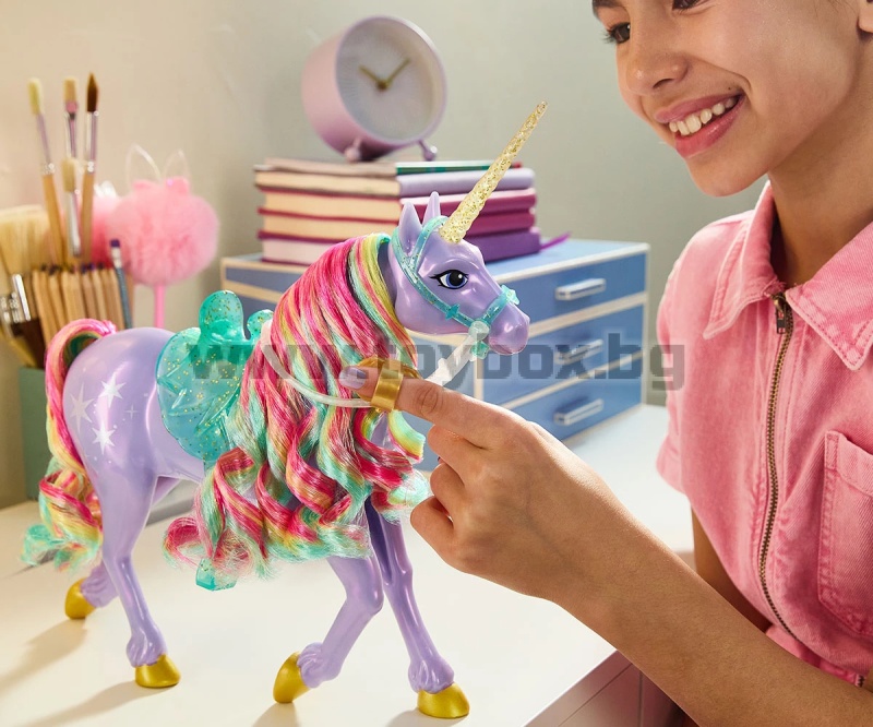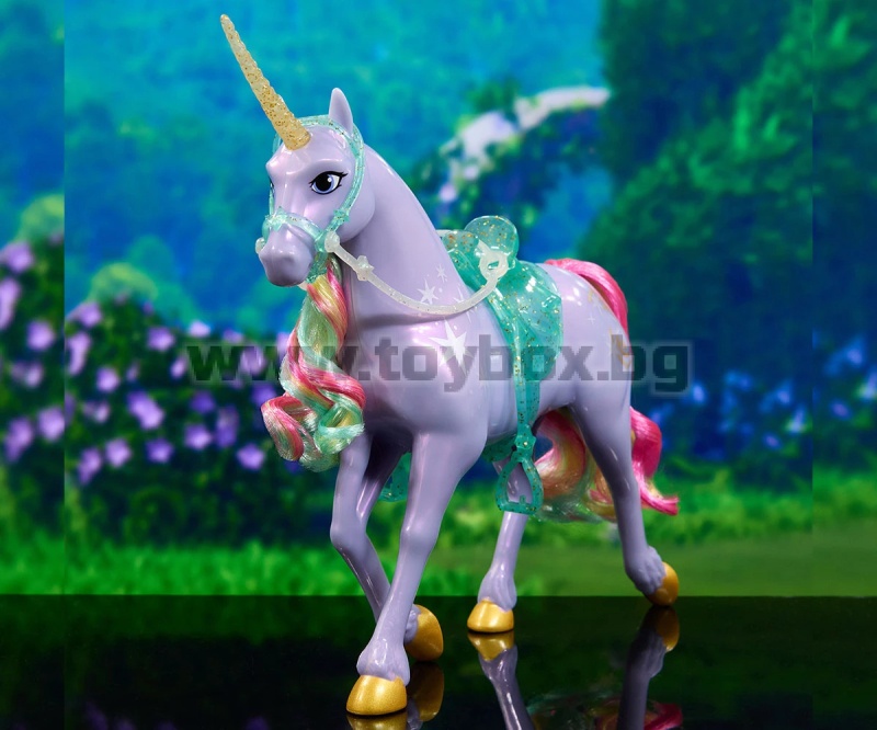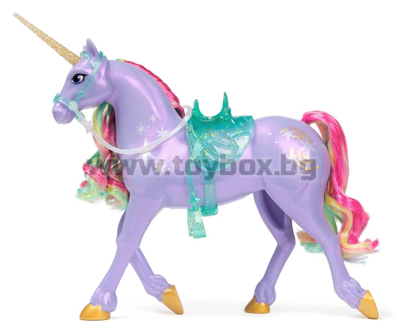 Отпразнувай силата на приятелството с еднорога на София — Wildstar от Unicorn Academy! Влез в магическия свят на Unicorn Academy, вдъхновен от анимирания сериал на Netflix и популярната поредица детски книги, където приятелството владее света! Този еднорог с размер 28 см пресъздава добросърдечния Wildstar, любимият партньор на София, с изключително внимание към детайла. Wildstar е изработен с металически знаци на Light Magic отстрани, блестящ рог, мека цветна грива и опашка, както и свалящи се прозрачни седло и юзда, които правят играта още по-реалистична. Нежно движи главата му, за да покажеш неговата личност и преживей отново вълшебната връзка между ездача и еднорога. Среши гривата и опашката му и язди към нови приключения, за да защитиш магията на Unicorn Island! С Wildstar магията на Unicorn Academy оживява! Потопи се в приключения, изпълнени с приятелство, смелост и магия – защото всеки герой има своя еднорог!