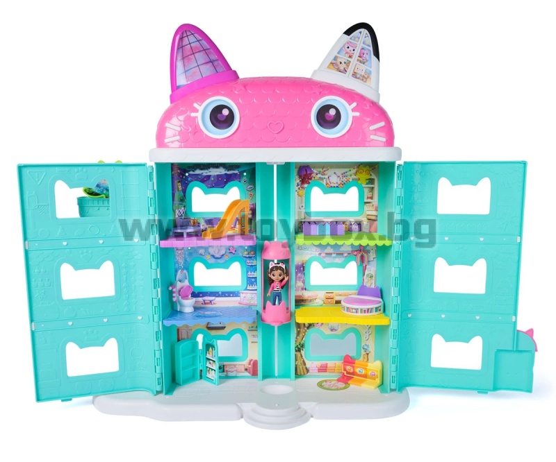 Gabby’s Dollhouse: The Movie – Къщата за кукли с вълшебни котешки приключения! Донеси магията от Gabby’s Dollhouse: The Movie у дома с тази невероятна двуетажна къща за кукли с височина над 60 см! С движещи се очи, 7 тематични стаи и 360° достъп за игра, тази къща е идеалното място за безкрайни котешки приключения!