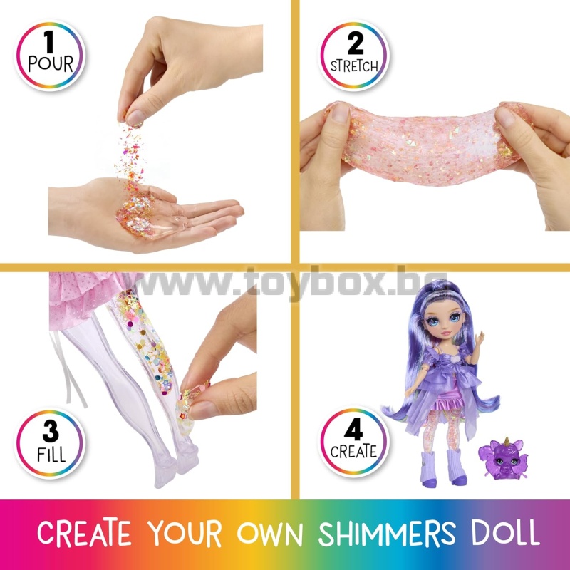 - Разгърнете креативността си: Rainbow High е по-вълшебна от всякога. Вече можете да създадете своя собствена кукла с цветовете на дъгата. Пакетът Rainbow Shimmers включва комплект слуз с цветовете на дъгата, за да създадете свои собствени уникални, цветни творения.