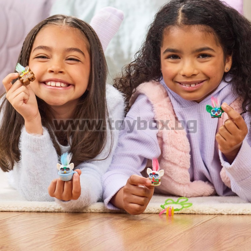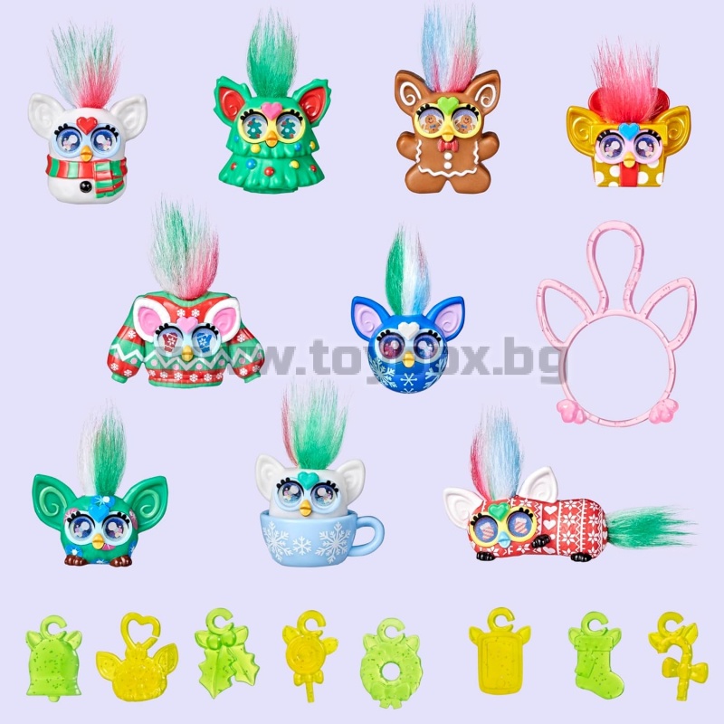 - 9 малки фигурки Furby Minis: 2,5 см колекционерски фигурки играчки се предлагат в празничен дизайн, като B. einem Pulli oder einem Weihnachtsbaum, aber mit Furby Gesichtern darauf