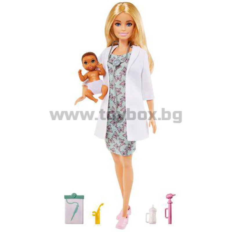 Опознай света на медицинските грижи с комплекта за игра Barbie® Педиатър! Barbie® обича да се грижи за малки бебета и за нея педиатър е идеалната професия. Barbie® педиатър (30,4см) е облечена в сладка рокля с шарка на пеперуди и бяла лекарска престилка, а нейният сладък пациент е с памперс. В игралния комплект са включени и 6 медицински аксесоара (някои от които куклата Barbie® педиатър може да държи): стетоскоп, термометър, осцилоскоп, клипборд, розово бебешко одеяло и бебешка бутилка, за да бъде пациентът щастлив и здрав. Куклата Barbie® педиатър може да прегледа бебето пациент със стетоскопа, да използва термометъра, да преглежда с осцилоскопа, да записва бележки в клипборда и да храни бебето с шишето, за да е щастливо и здраво.