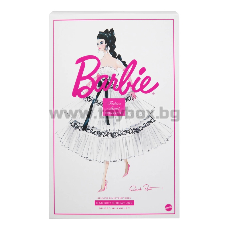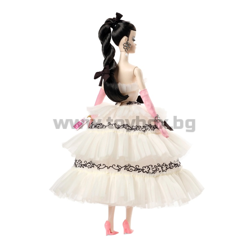 Елегантна и очарователна – четвъртата кукла от ексклузивната колекция „Барби модни модели“ е почит към класическата винтидж мода. Визията ѝ е вечна, но уникална: тя носи пълна кринолинова пола, направена още по-обемна от плавни пластове бяла органза и тюл с волани. Черна флорална бродерия и малки кристали добавят дълбочина към полата, докато розови сатенени ръкавици с дължина до опера и съответстващи обувки на висок ток внасят цветен акцент в иначе монохромния ансамбъл.