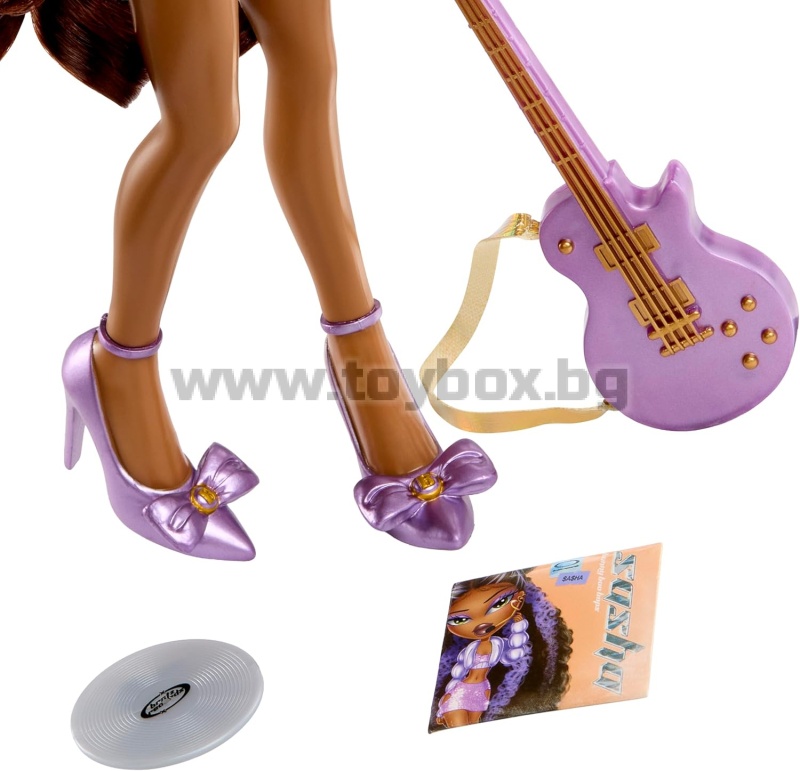 - КУКЛА САША ПОП СТАРЗ: Саша внася стила на поп сладурана в линията Bratz Pop Starz; облечена в блестящо яке и пола и лилави хромирани токчета.